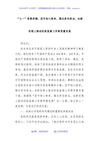 / “七一”党课讲稿:坚守初心使命,强化责任担当,在新征程上推动纪检监察工作高质量发展