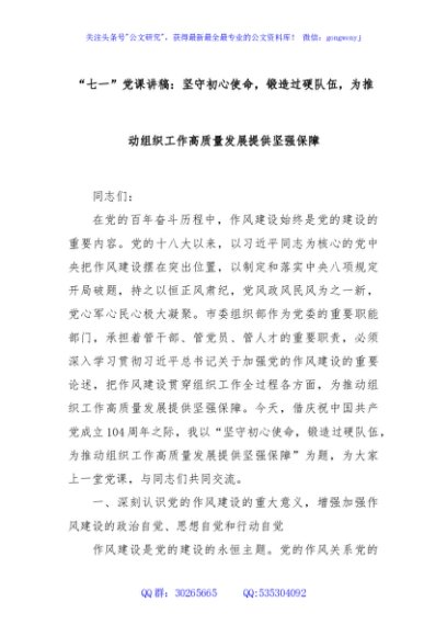 / “七一”党课讲稿:坚守初心使命,锻造过硬队伍,为推动组织工作高质量发展提供坚强保障