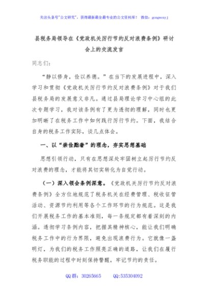 / 县税务局领导在《党政机关厉行节约反对浪费条例》研讨会上的交流发言