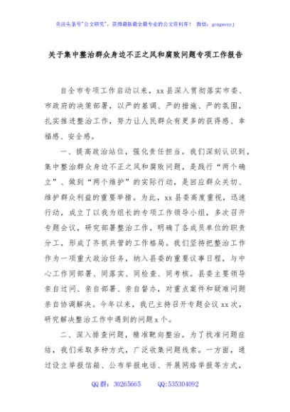 / 关于集中整治群众身边不正之风和腐败问题专项工作报告