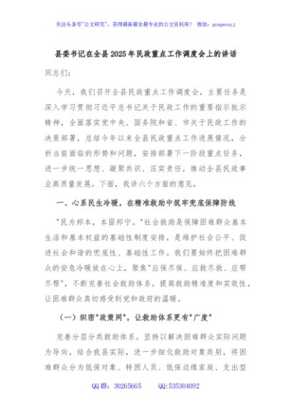/ 县委书记在全县2025年民政重点工作调度会上的讲话
