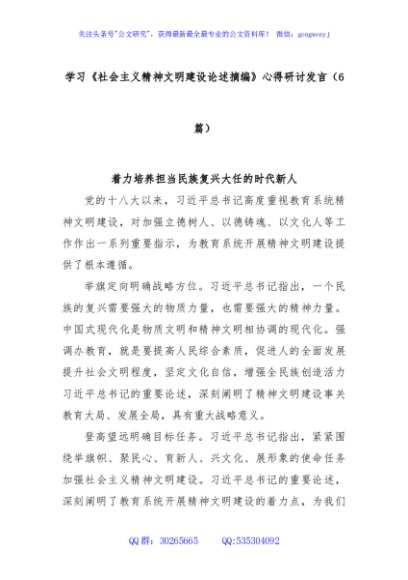 (6篇)学习《社会主义精神文明建设论述摘编》心得研讨发言