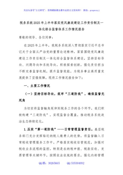 / 税务系统2025年上半年落实党风廉政建设工作责任制及一体化综合监督体系工作情况报告