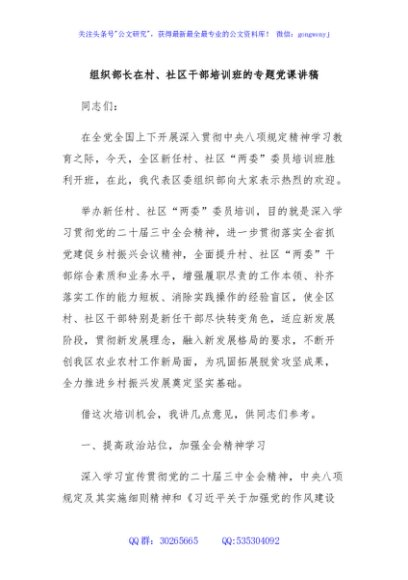 / 组织部长在村、社区干部培训班的专题党课讲稿