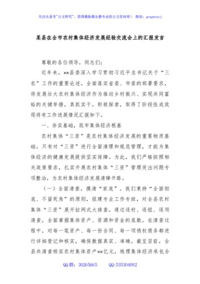 / 某县在全市农村集体经济发展经验交流会上的汇报发言