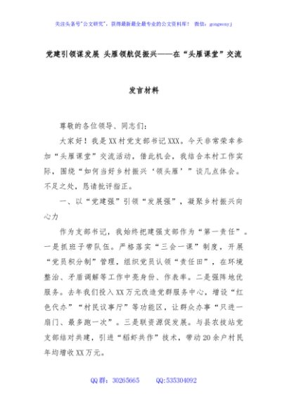 / 党建引领谋发展 头雁领航促振兴——在“头雁课堂”交流发言材料