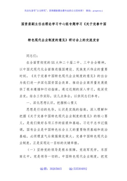 / 国资委副主任在理论学习中心组专题学习《关于完善中国特色现代企业制度的意见》研讨会上的交流发言