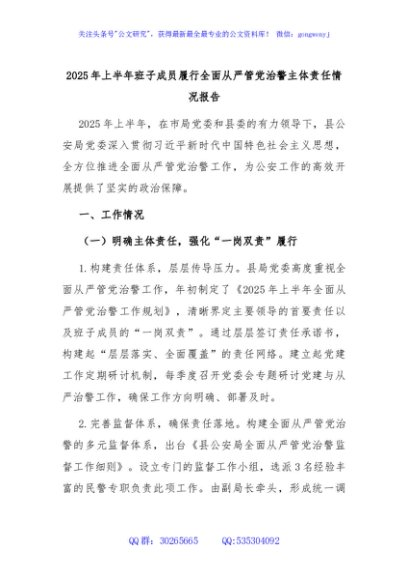 / 2025年上半年班子成员履行全面从严管党治警主体责任情况报告