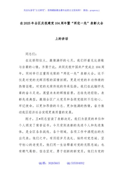 / 在2025年全区庆祝建党104周年暨“两优一先”表彰大会上的讲话