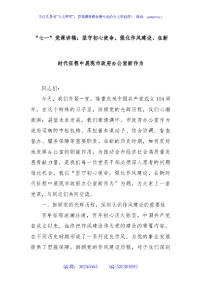 / “七一”党课讲稿:坚守初心使命,强化作风建设,在新时代征程中展现市政府办公室新作为
