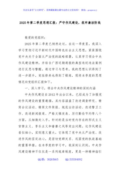 / 2025年第二季度思想汇报:严守作风建设,筑牢廉洁防线