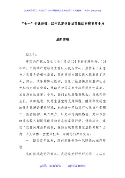 / “七一”党课讲稿:以作风建设新成效推动医院高质量发展新突破
