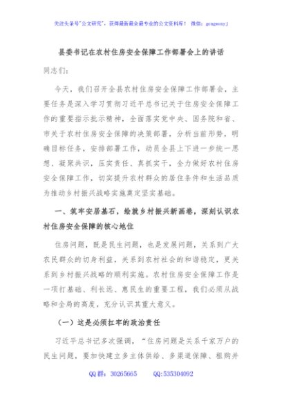 / 县委书记在农村住房安全保障工作部署会上的讲话
