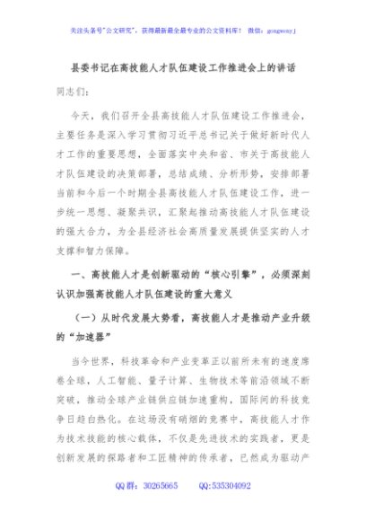 / 县委书记在高技能人才队伍建设工作推进会上的讲话