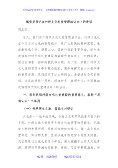 / 镇党委书记在村级文化礼堂管理培训会上的讲话