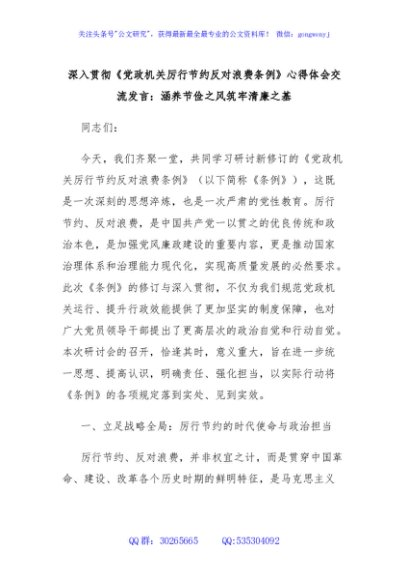 / 深入贯彻《党政机关厉行节约反对浪费条例》心得体会交流发言:涵养节俭之风筑牢清廉之基