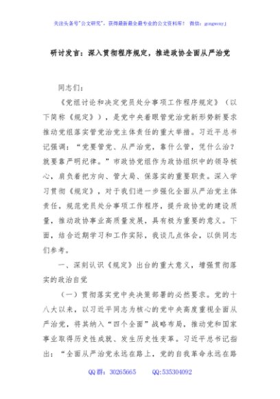 / 研讨发言:深入贯彻程序规定,推进政协全面从严治党