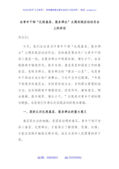 / 在青年干部“扎根基层、服务群众”主题实践活动动员会上的讲话