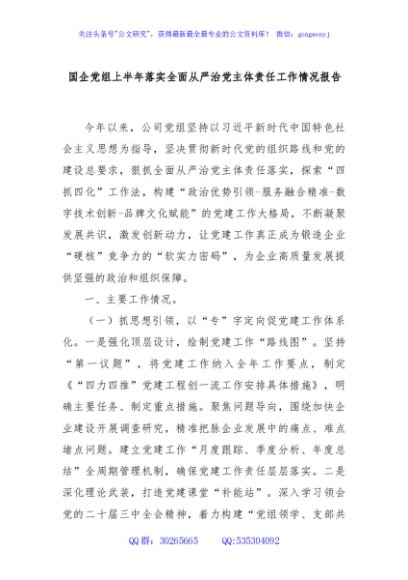 / 国企党组上半年落实全面从严治党主体责任工作情况报告