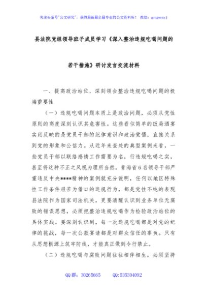 / 县法院党组领导班子成员学习《深入整治违规吃喝问题的若干措施》研讨发言交流材料