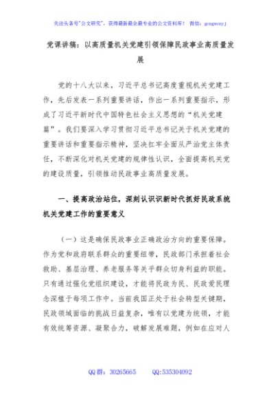 / 党课讲稿:以高质量机关党建引领保障民政事业高质量发展