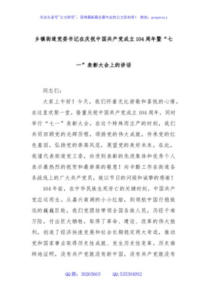 / 乡镇街道党委书记在庆祝中国共产党成立104周年暨“七一”表彰大会上的讲话