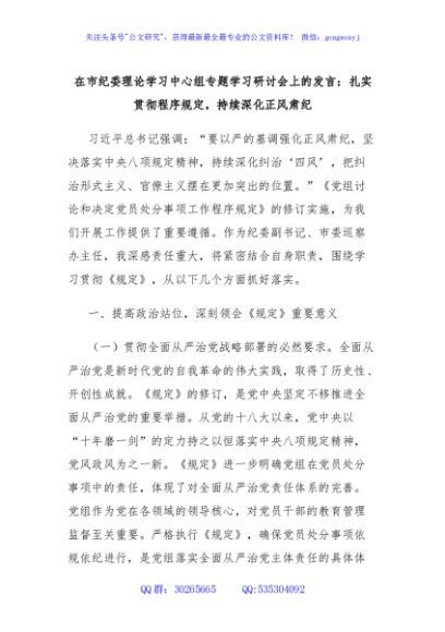/ 在市纪委理论学习中心组专题学习研讨会上的发言:扎实贯彻程序规定,持续深化正风肃纪