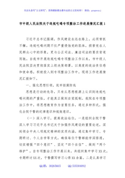 / 市中级人民法院关于违规吃喝专项整治工作进展情况汇报1