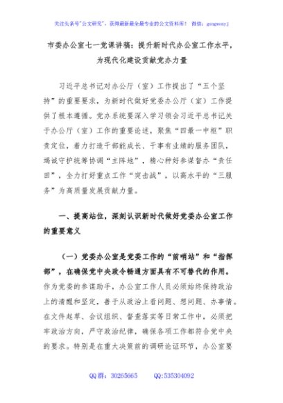 / 市委办公室七一党课讲稿:提升新时代办公室工作水平,为现代化建设贡献党办力量