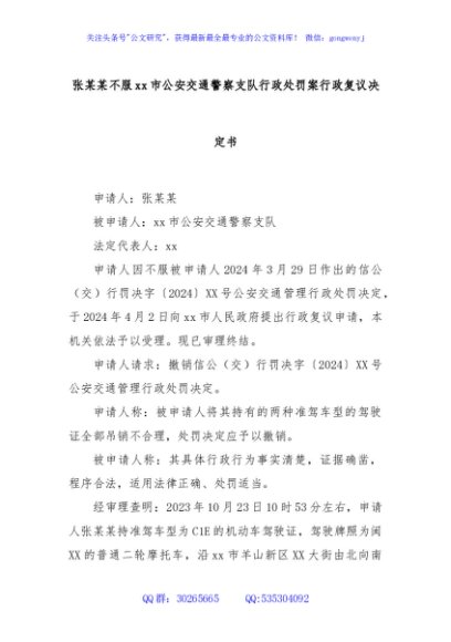 / 张某某不服xx市公安交通警察支队行政处罚案行政复议决定书