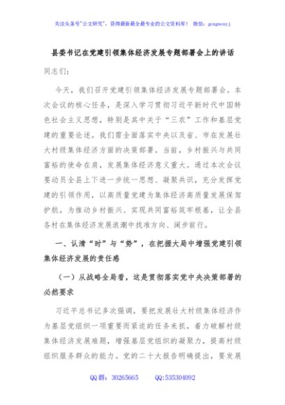 / 县委书记在党建引领集体经济发展专题部署会上的讲话