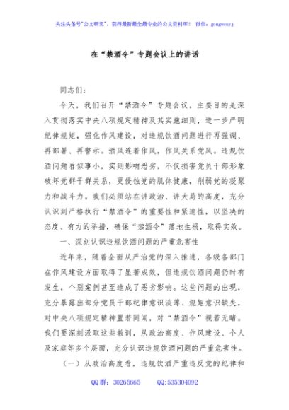 在“禁酒令”专题会议上的讲话