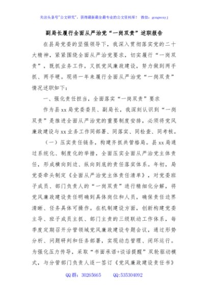 / 副局长履行全面从严治党“一岗双责”述职报告