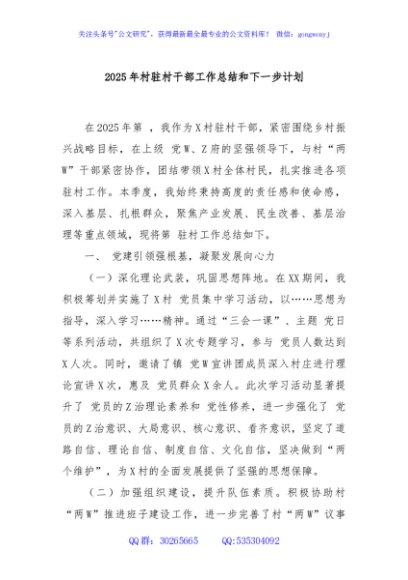 / 2025年村驻村干部工作总结和下一步计划