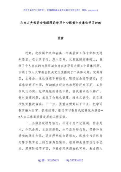 / 在市人大常委会党组理论学习中心组第七次集体学习时的发言
