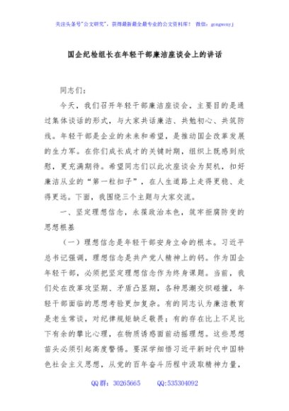 / 国企纪检组长在年轻干部廉洁座谈会上的讲话