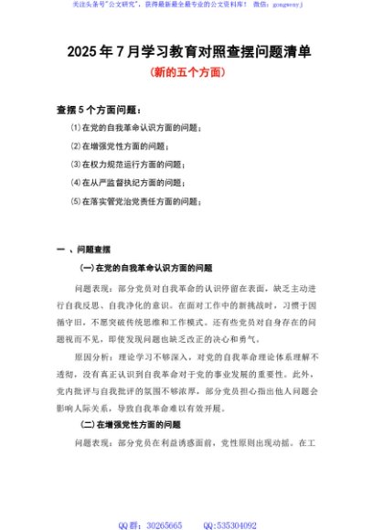 / 在党的自我革命认识、增强党性、权力规范运行、从严监督执纪、落实管党治党责任方面(新的五个方面)学习教育对照查摆问题清单