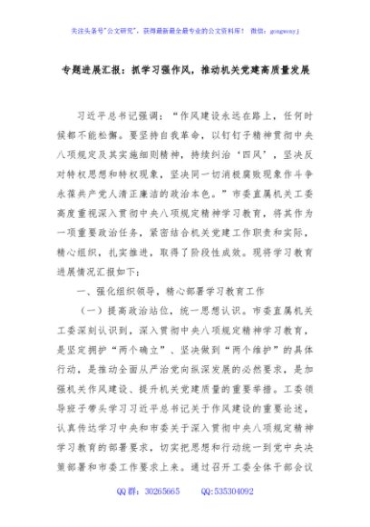 专题进展汇报:抓学习强作风,推动机关党建高质量发展