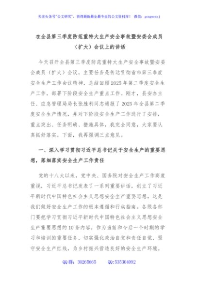 / 在全县第三季度防范重特大生产安全事故暨安委会成员(扩大)会议上的讲话