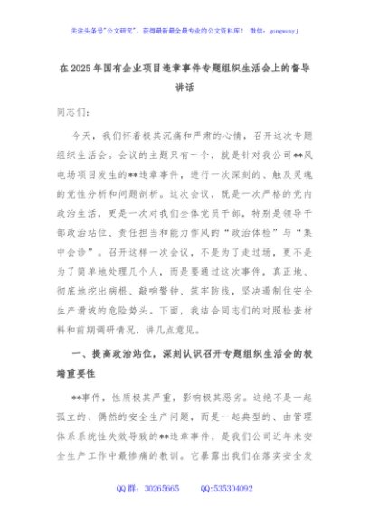 / 在2025年国有企业项目违章事件专题组织生活会上的督导讲话