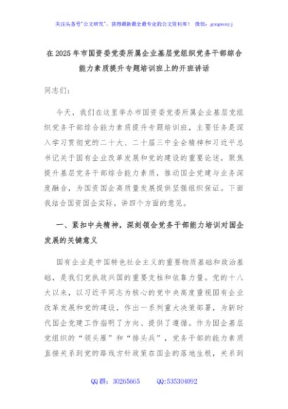 / 在2025年市国资委党委所属企业基层党组织党务干部综合能力素质提升专题培训班上的开班讲话