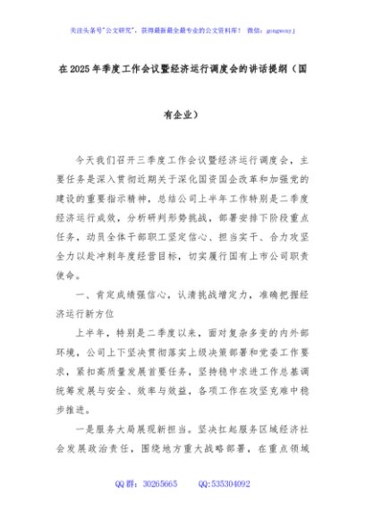 / 在2025年季度工作会议暨经济运行调度会的讲话提纲(国有企业)