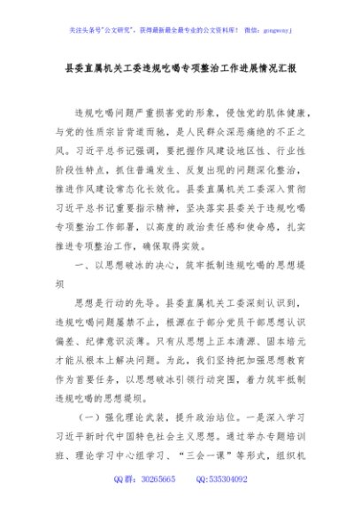 / 县委直属机关工委违规吃喝专项整治工作进展情况汇报