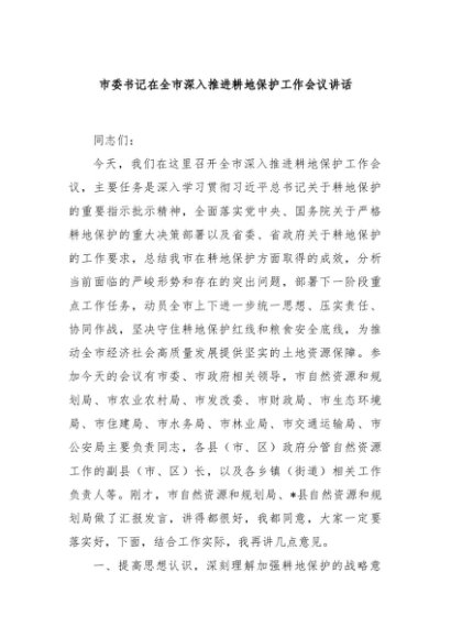 / 市委书记在全市深入推进耕地保护工作会议讲话