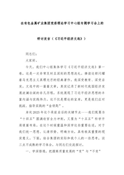 / 在有色金属矿业集团党委理论学习中心组专题学习会上的研讨发言(《总书记经济文选》)