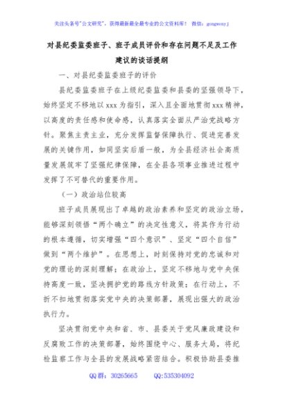 / 对县纪委监委班子、班子成员评价和存在问题不足及工作建议的谈话提纲