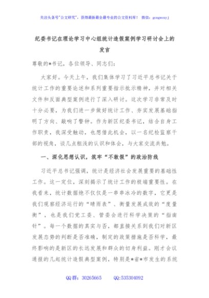 / 纪委书记在理论学习中心组统计造假案例学习研讨会上的发言