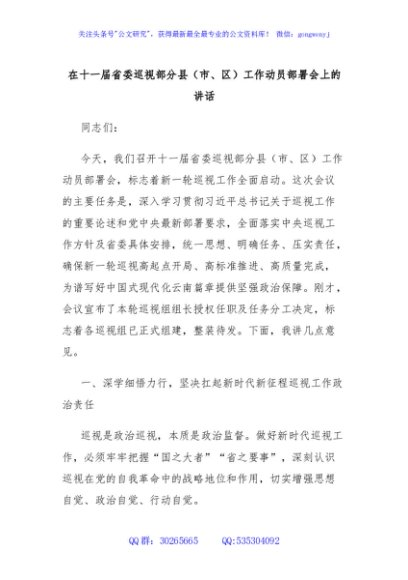 / 在十一届省委巡视部分县(市、区)工作动员部署会上的讲话