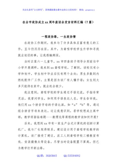 / (7篇)在全市政协成立xx周年座谈会发言材料汇编