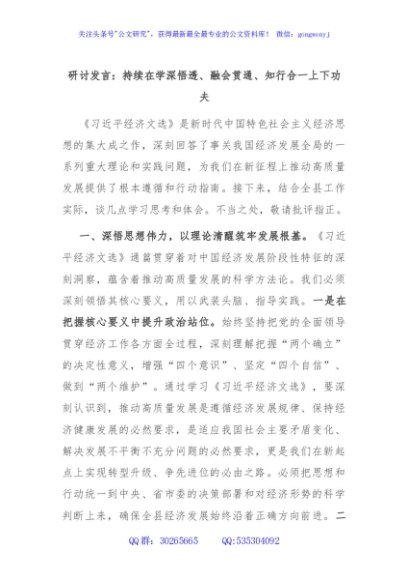 / 研讨发言:持续在学深悟透、融会贯通、知行合一上下功夫